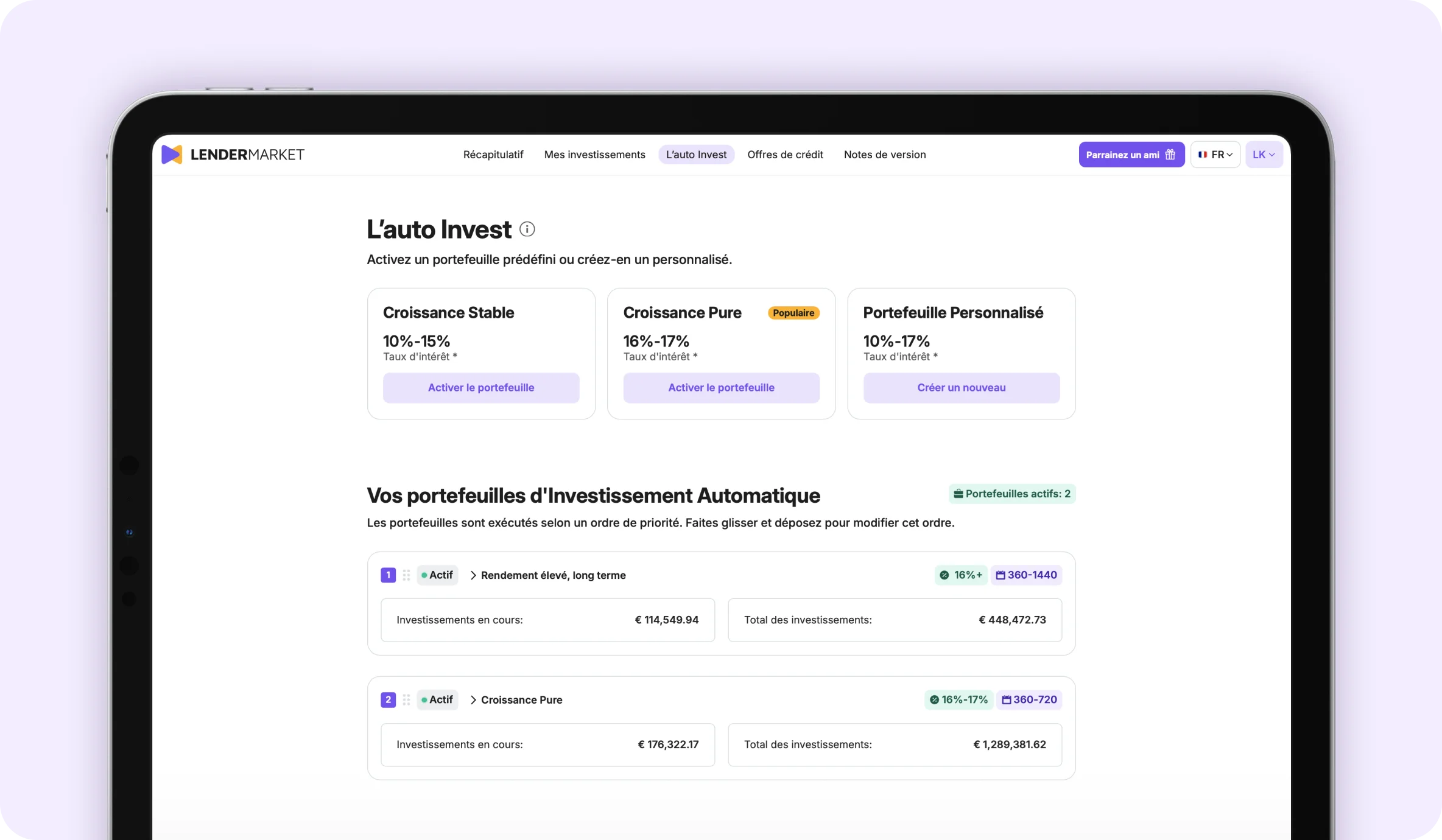 Auto Invest investit automatiquement votre solde disponible dans des prêts correspondant à vos critères choisis, réinvestissant continuellement vos fonds pour maximiser les rendements.