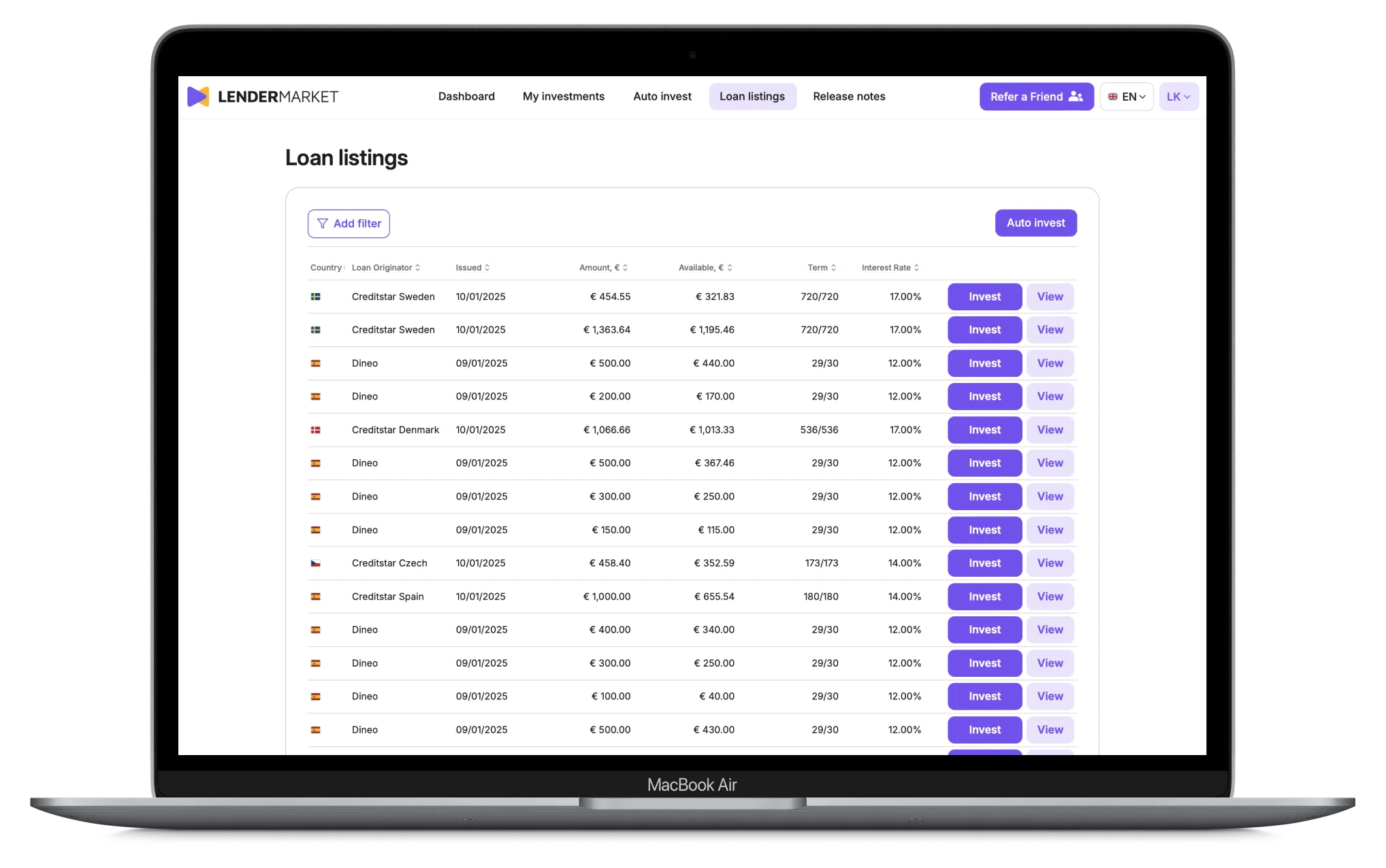 Explorez les prêts disponibles et investissez dans ceux qui répondent à vos critères, ou activez l'option Auto Invest pour automatiser votre investissement.